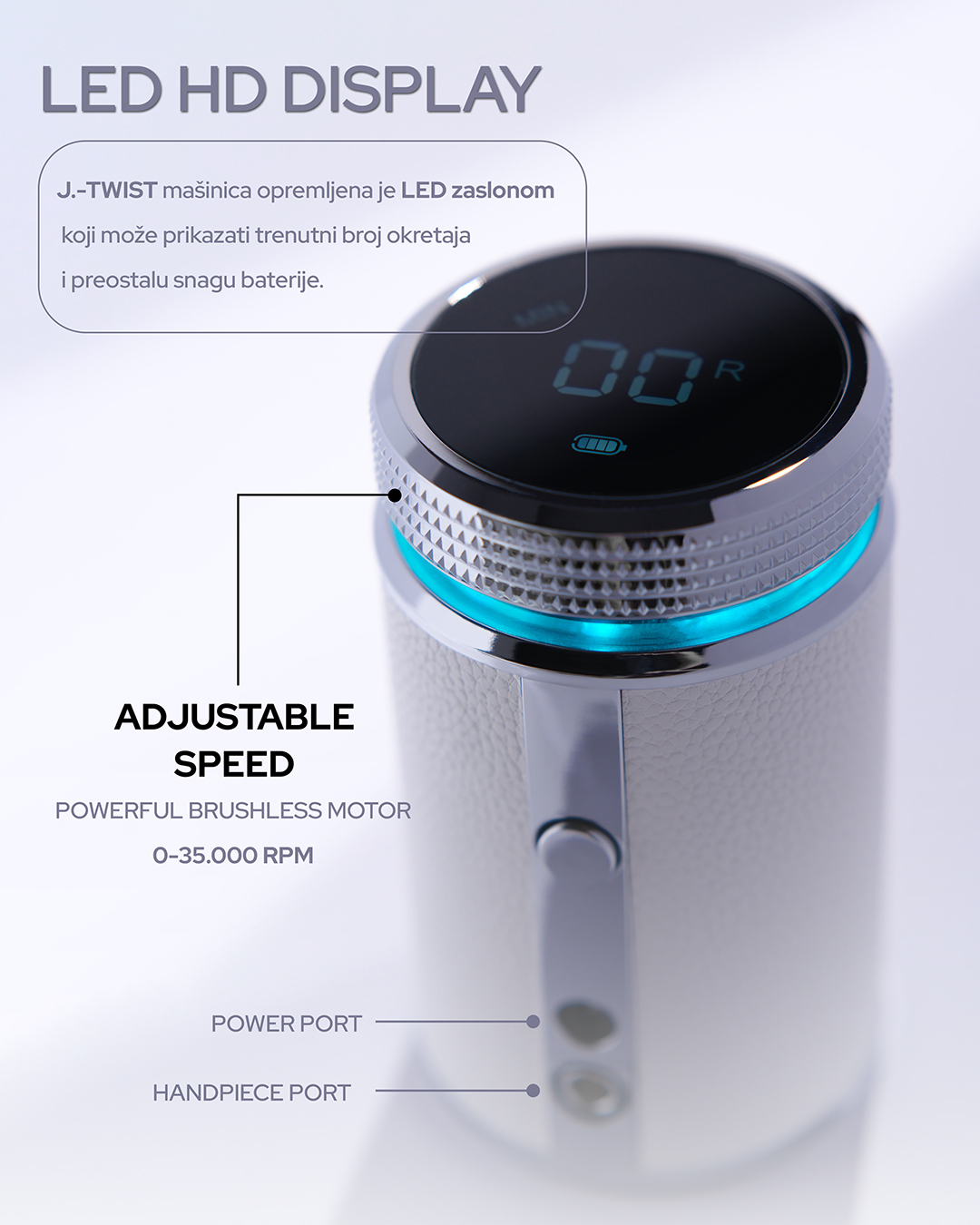 J.-TWIST mašinica dolazi u elegantnom, modernom “space-futuristic” bijelom kućištu sa “snake skin” efektom, srebrnim detaljima i LED osvjetljenjem, što ju čini vizualno atraktivnom. Digitalni LED zaslon na dodir i tihi brushless motor pretvaraju je u nezaobilazan alat svakog profesionalnog salona, estetski dojmljivu i tehnički besprijekornu.