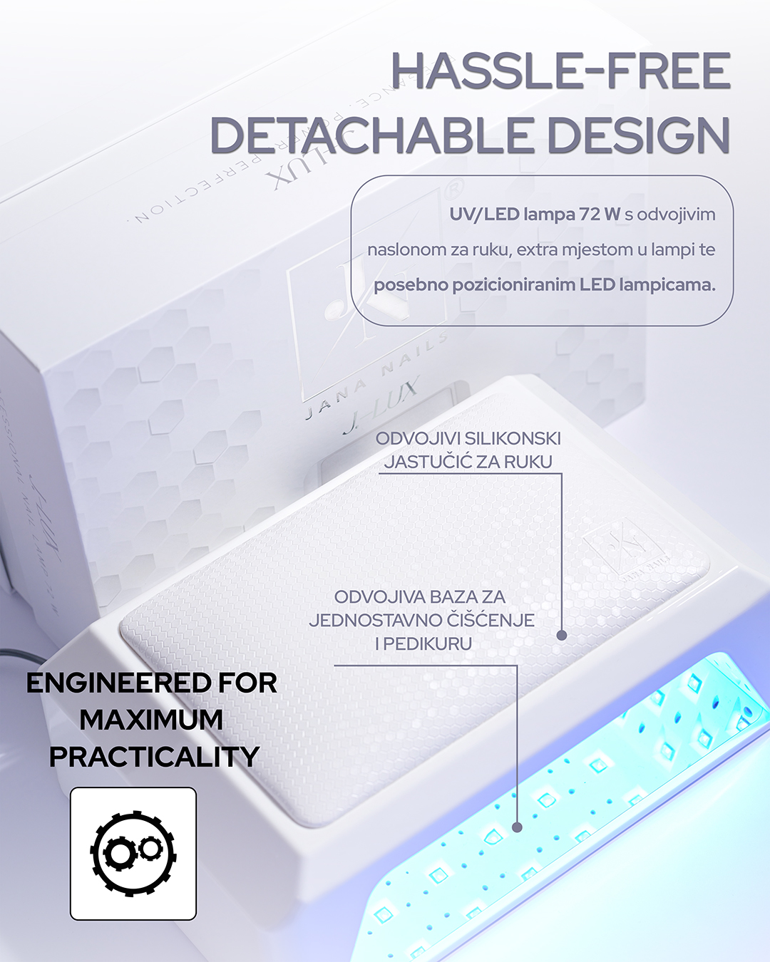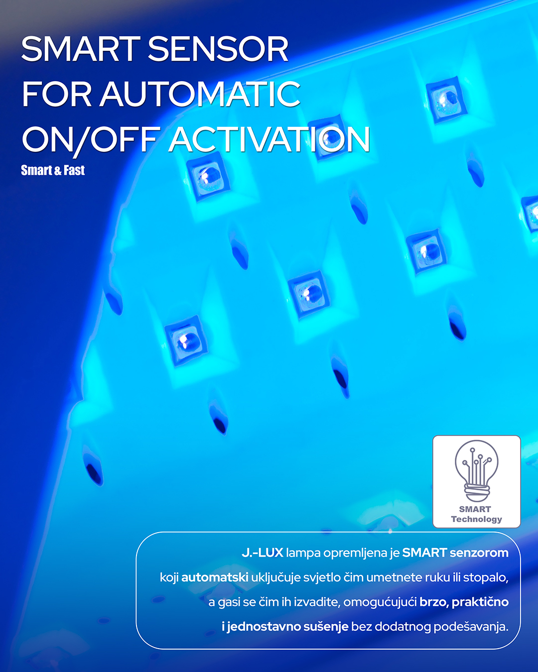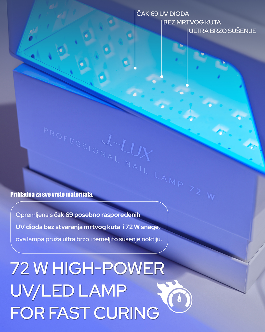 Svaka dioda u J.-LUX lampi strateški je postavljena kako bi osigurala potpuno ravnomjerno sušenje bez tzv. mrtvih kutova, što jamči savršen rezultat u rekordnom vremenu.