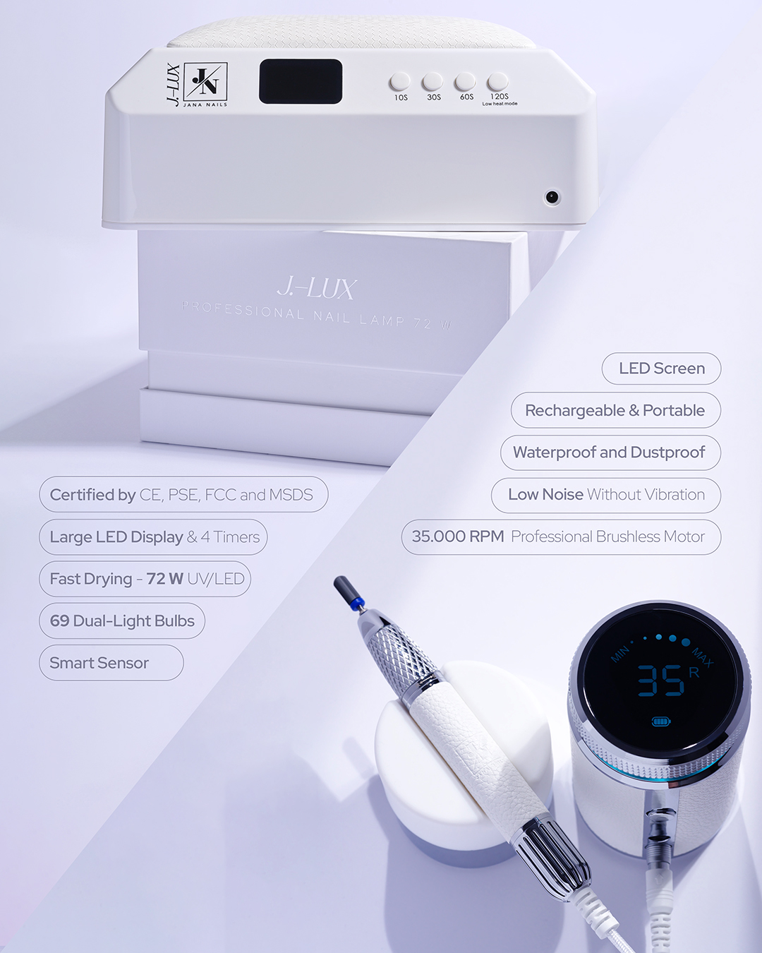 Jana Nails mašinica i UV/LED lampa sada dolaze u svojoj najnaprednijoj verziji – precizno izrađene, moderno dizajnirane i idealne za svakoga tko želi raditi s lakoćom i stilom. Duo koji je spoj vrhunskih performansi, čistog dizajna, kvalitetnih materijala i funkcionalnosti koje čine razliku u svakodnevnom radu.