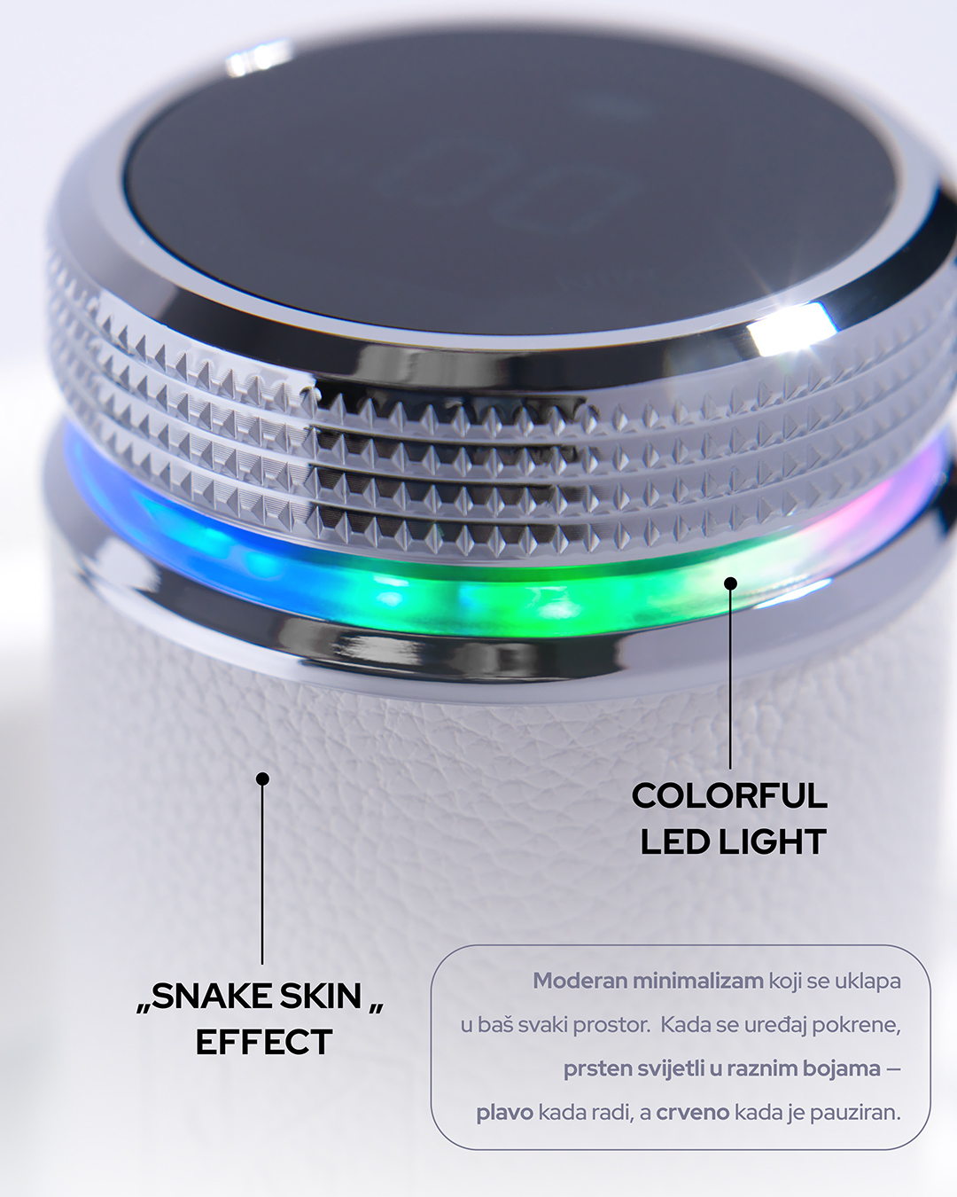 ✔ LED prsten u bojama – vizualni prikaz statusa rada on / pause.