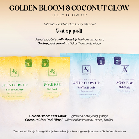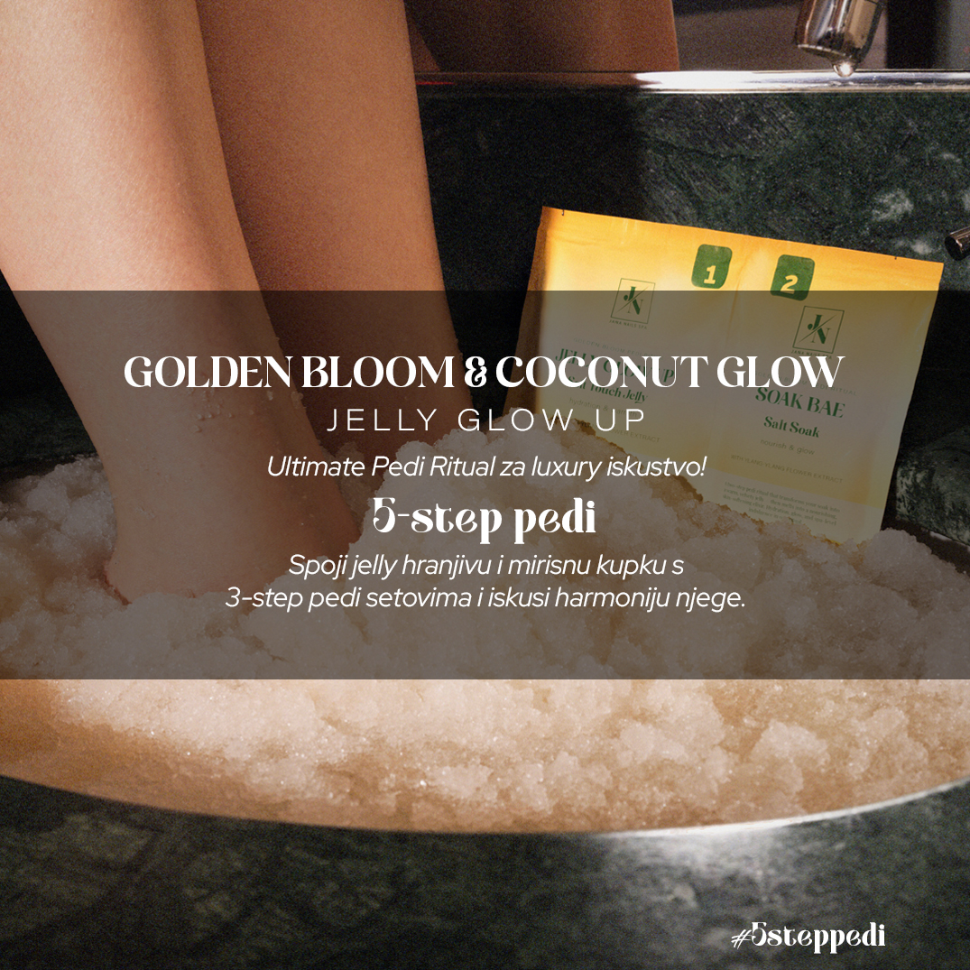 Za luksuzniji doživljaj odaberi 5-step Pedi Set i spoji jelly hranjivu i mirisnu kupku Coconut Glow & Golden Bloom s 3-step pedi setovima.😍