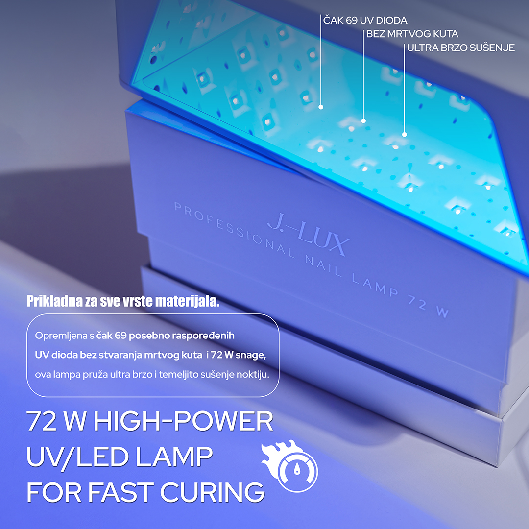 Upoznaj J.-LUX – profesionalnu UV/LED lampu s čak 69 dioda i snagom od 72 W, stvorenu za brzu i ravnomjernu polimerizaciju svih vrsta gelova i trajnih lakova.
