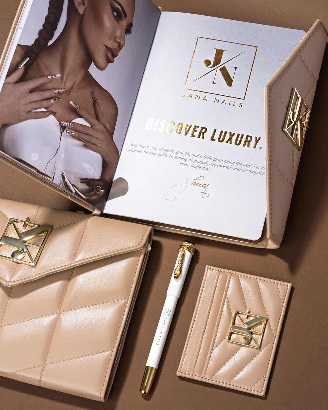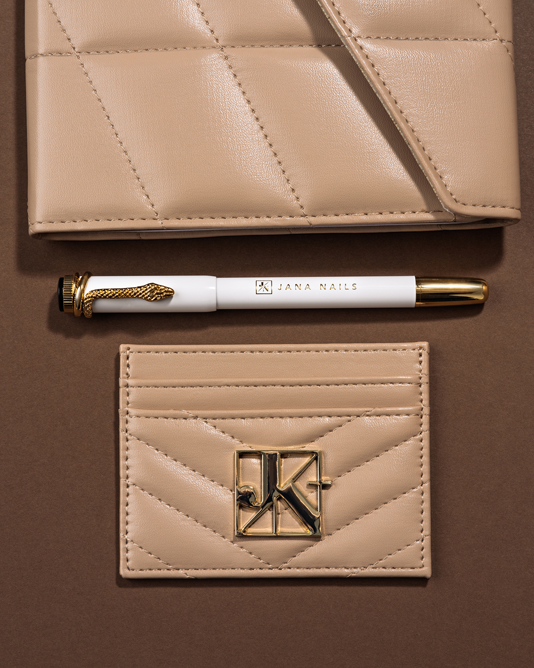 Za dodatnu organizaciju Jana Nails predstavlja mali, profinjeni dodatak – mini etui za kartice. U nude tonu i s prepoznatljivim zlatnim JN logom, savršeno se slaže s rokovnikom i tvori set koji odiše praktičnošću i jednostavnošću.