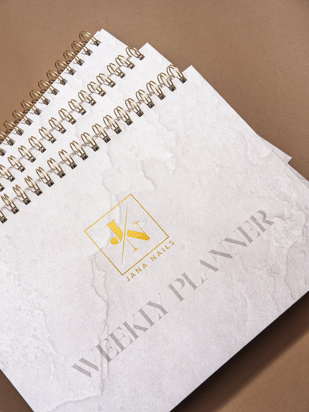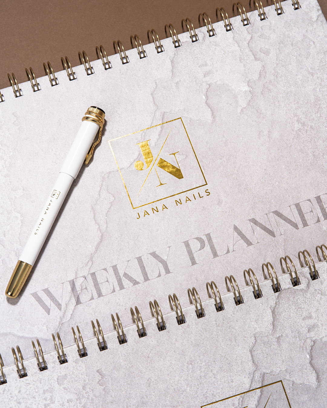 Za one koji vole imati sve planove jasno ispred sebe – tu je veliki JN tjedni stolni planer. Dolazi u stone-look izdanju s nježnim sivim tonovima i decentnim mramornim uzorkom, dok zlatni JN logo i zlatni spiralni uvez daju završni trendy touch. Minimalistički, a efektan, ovaj planer je sve što ti treba za organizaciju – stylish detalj koji će sigurno krasiti tvoj radni stol ili pult u salonu. Dostupan je na hrvatskom i engleskom jeziku, pa ga svatko može prilagoditi svom načinu planiranja.