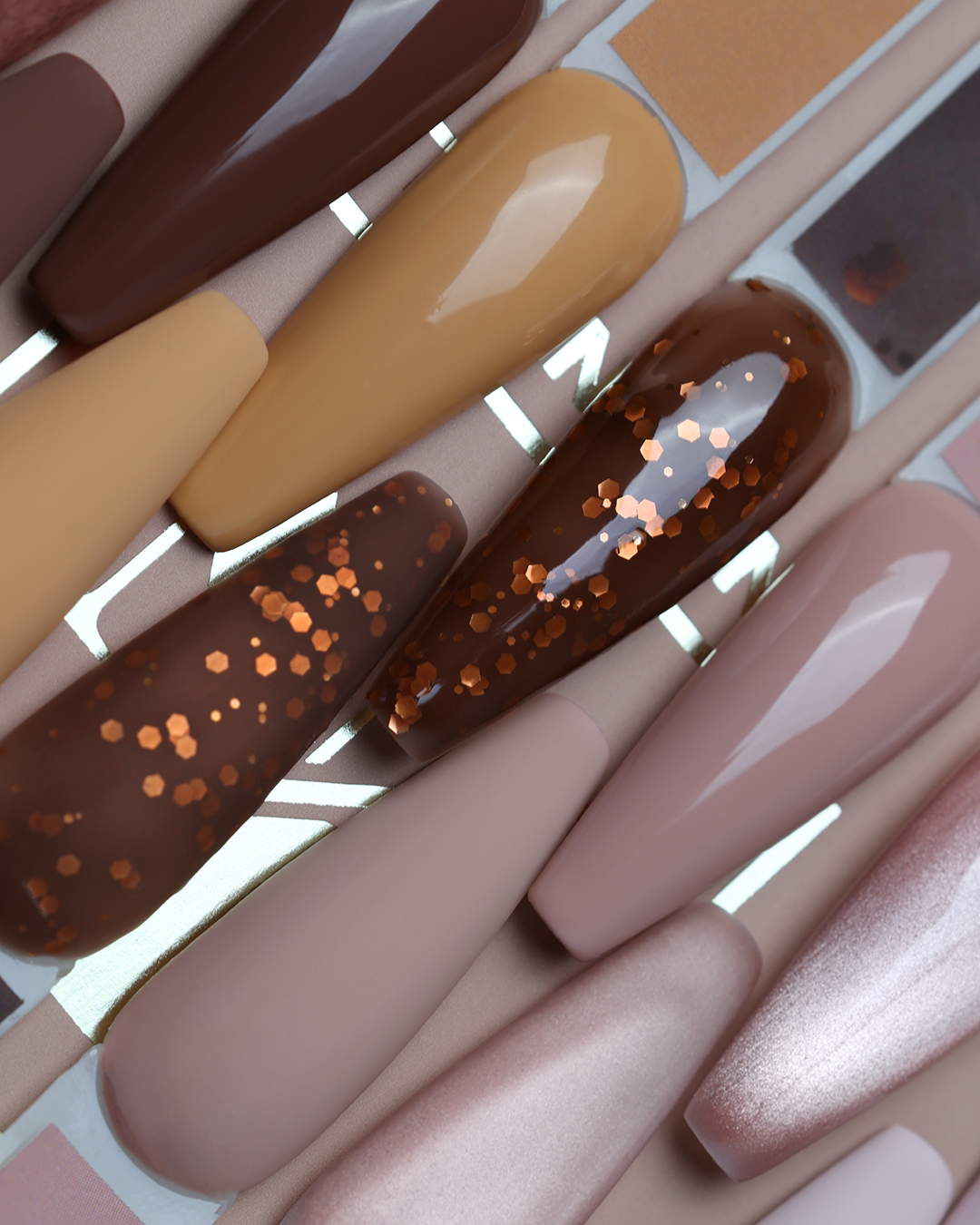 🔥Uz kupnju cijelog Tra le Calli box-a na poklon dobiješ matchy semitransparentni smeđi top coat Sweet sin, obogaćenim većim i manjim bakrenim heksagonima i glitter česticama.