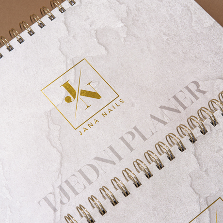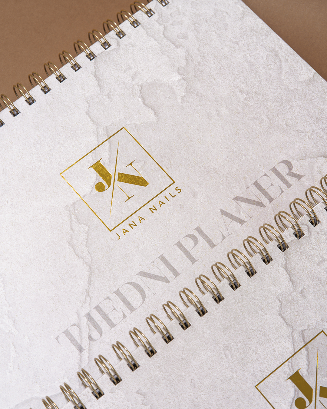 Dolazi u stone-look izdanju s nježnim sivim tonovima i decentnim mramornim uzorkom, dok zlatni JN logo i zlatni spiralni uvez daju završni trendy touch.