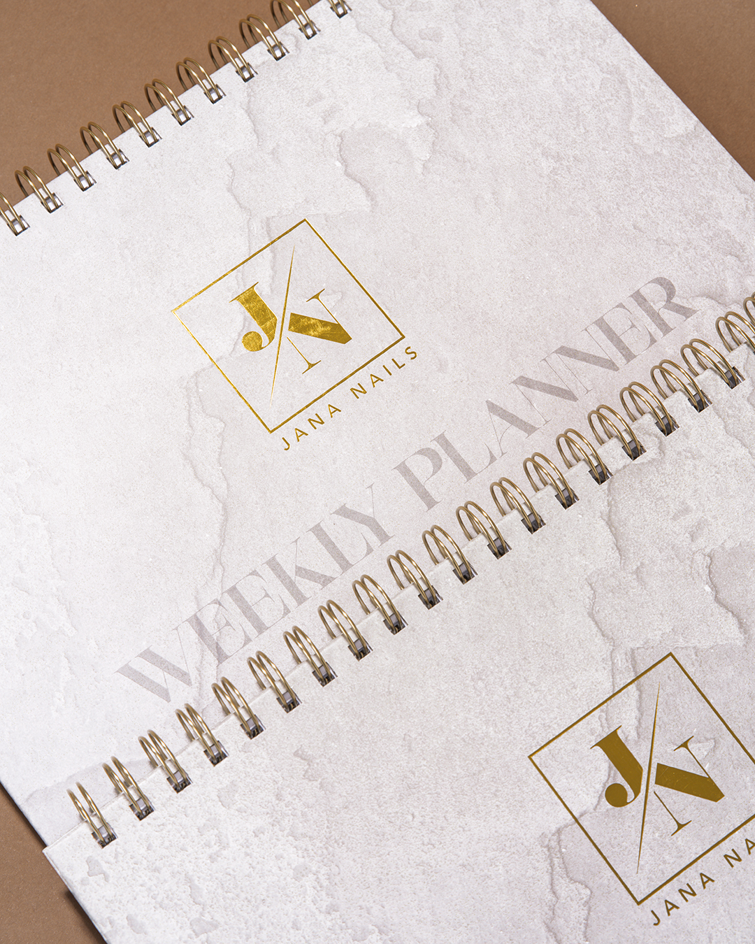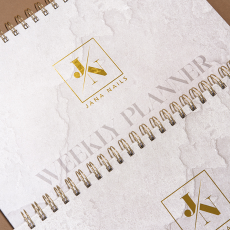 Dolazi u stone-look izdanju s nježnim sivim tonovima i decentnim mramornim uzorkom, dok zlatni JN logo i zlatni spiralni uvez daju završni trendy touch.