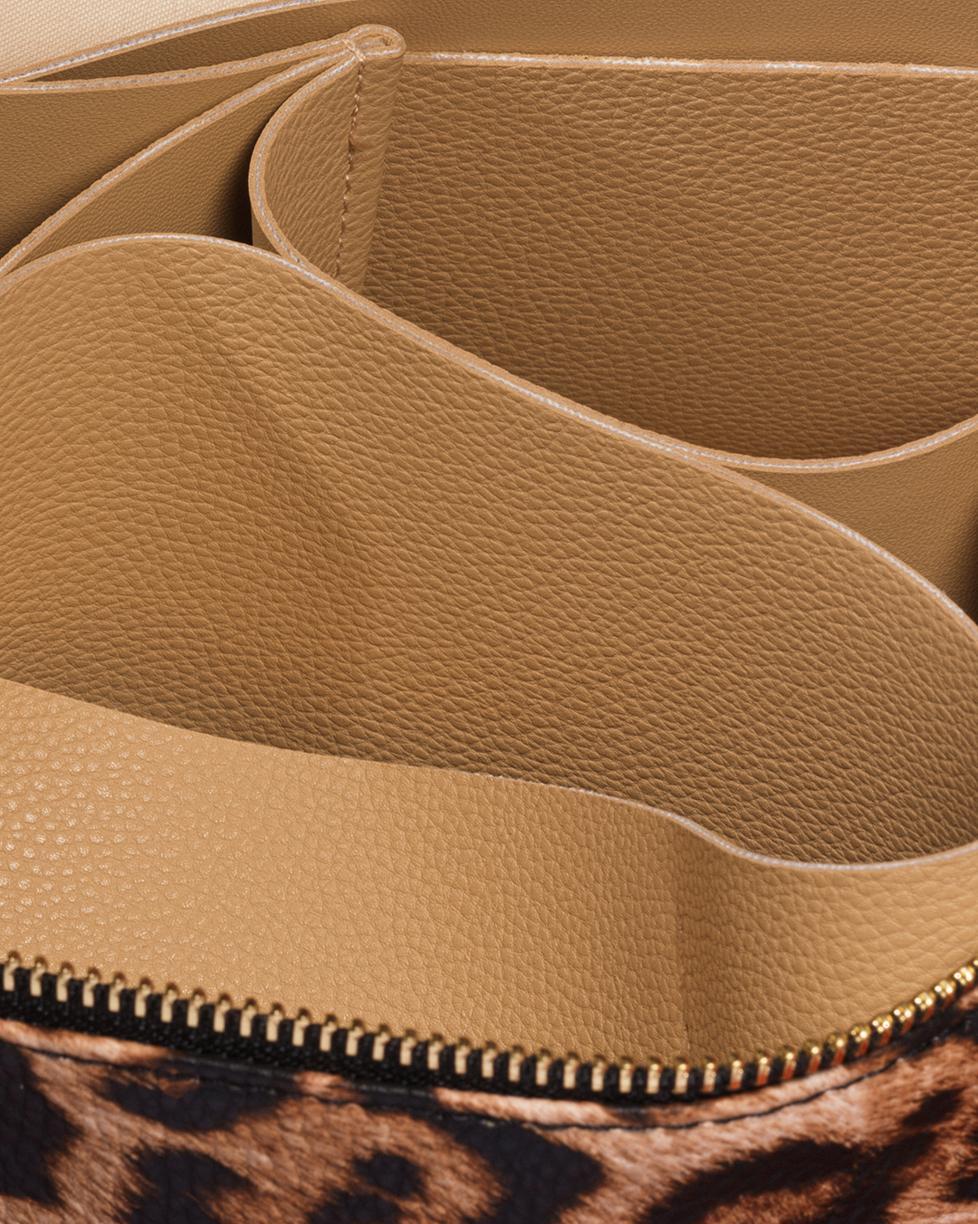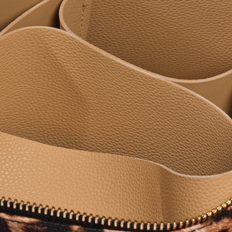 Napravljen od čvrste imitacije kože, prostran, pregledan i kompaktan, s leopard uzorkom i stylish zlatnim detaljima. Čvrsta ručka olakšava nošenje, a dizajn prati tvoj ritam – gornji dio je uži, bez pregrada, s elastičnim držačima za organizaciju i s preklopnim ogledalom za brze popravke. Donji dio je širi i prostraniji, s odvojivim pregradama koje po potrebi možeš ukloniti, tako da cijelu organizaciju prilagodiš svom stilu i potrebama.